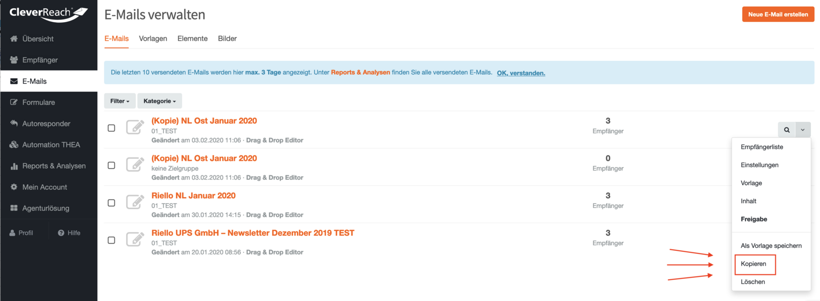 - Den Newsletter bitte NICHT als Vorlage speichern, hier können unter anderem die Links kaputt gehen. Vorlagen sind nur der Programmierung vorbehalten! Bitte immer als Kopie abspeichern!