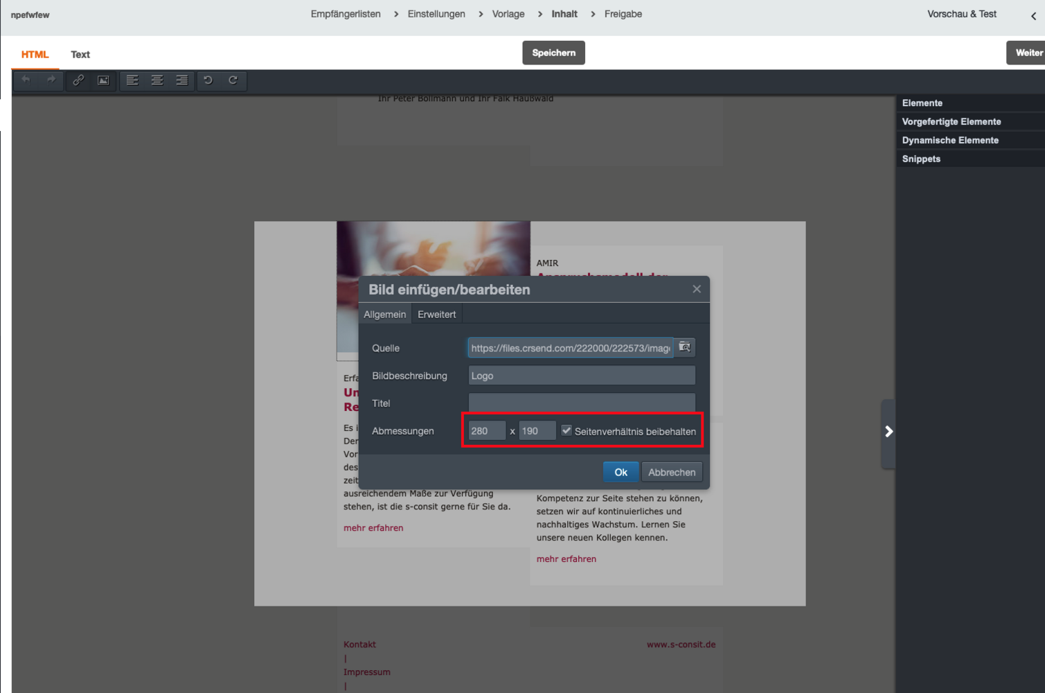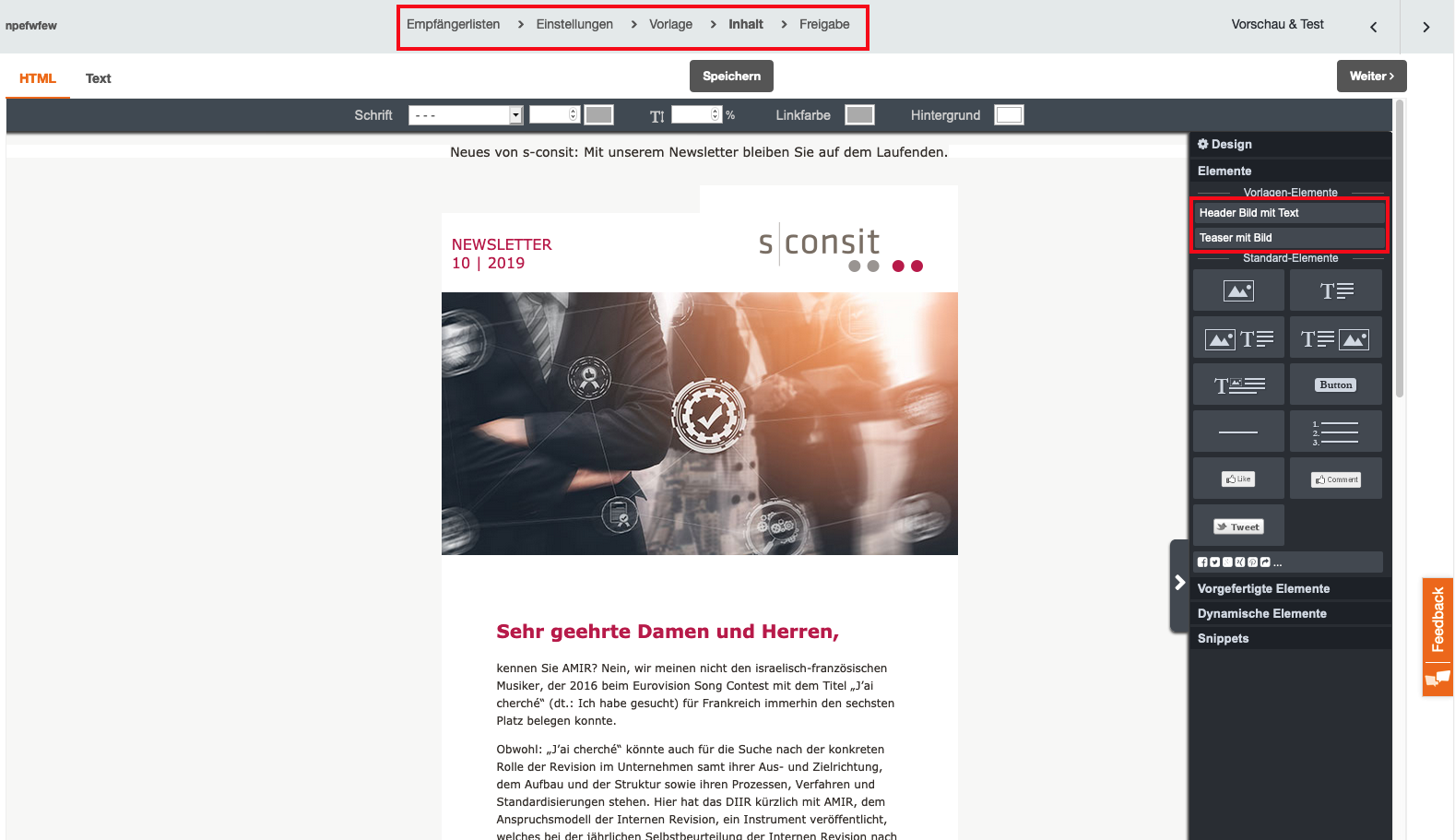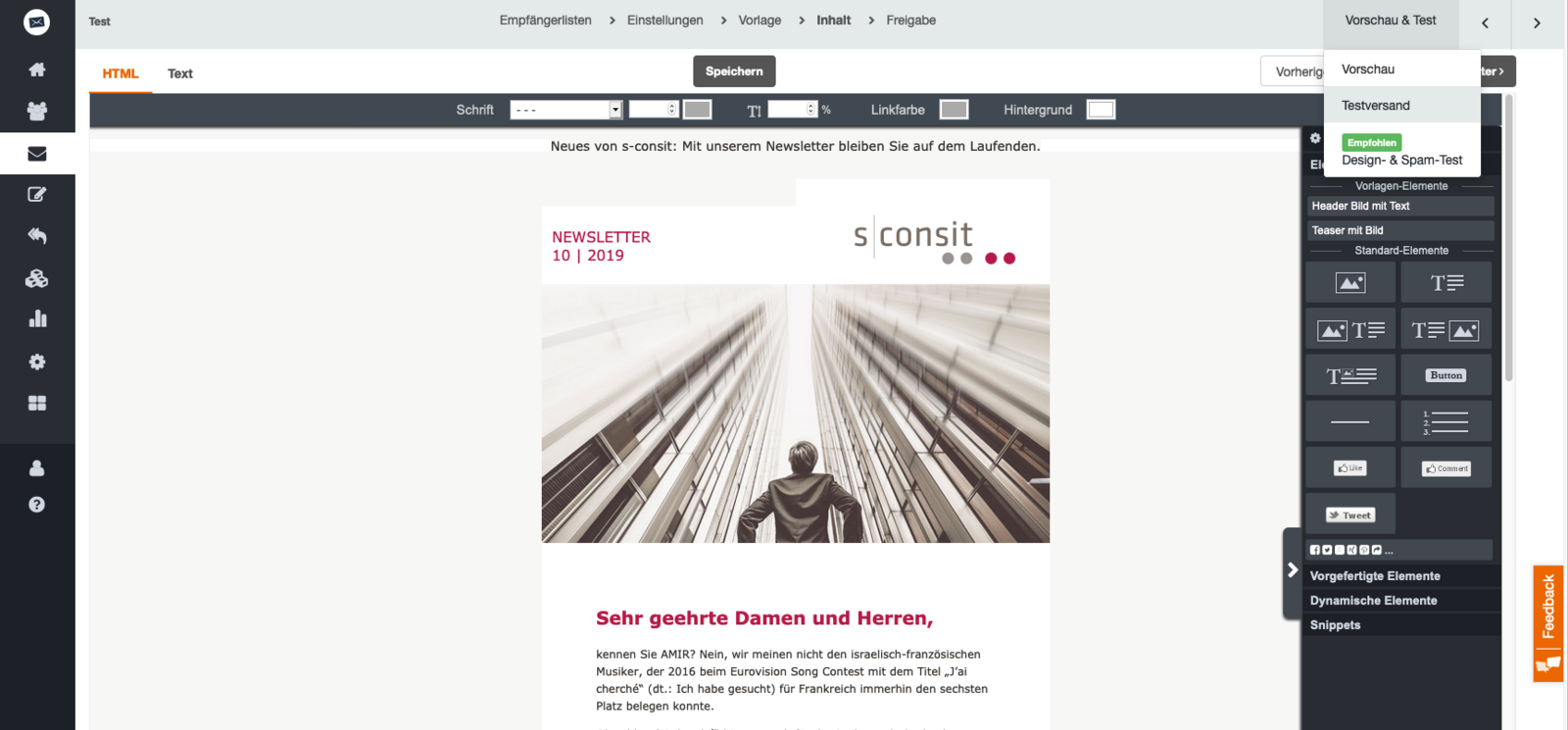 In der rechten Seitenleiste finden sich die Elemente, die im jeweiligen Newsletter zur Verfügung stehen, z. B. Headgrafik, Text, Zwei Teaser, Drei Teaser etc. Die Auswahl an Elementen ist immer vom jeweiligen Design abhängig und variiert stark – bei s-consit gibt es lediglich zwei Elemente, beim Scandinavian Park mehr als 10. Neue Elemente können per Drag and Drop im Newsletter ergänzt werden.