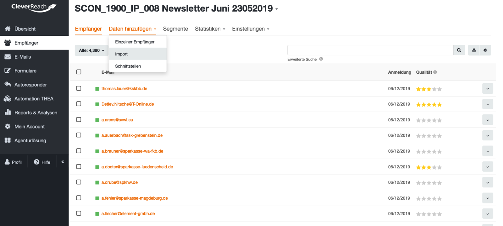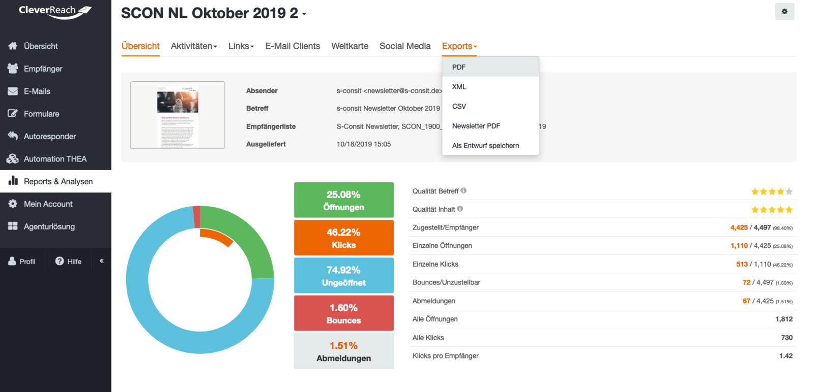 Nach dem Versand kann die aktuelle Auswertung der Öffnungs- und Klickzahlen sowie weiterer Kennzahlen unter „Reports & Analysen eingesehen werden. Wünscht der Kunde eine Auswertung, so schicken wir den Export in PDF-Form an den Projektleiter.