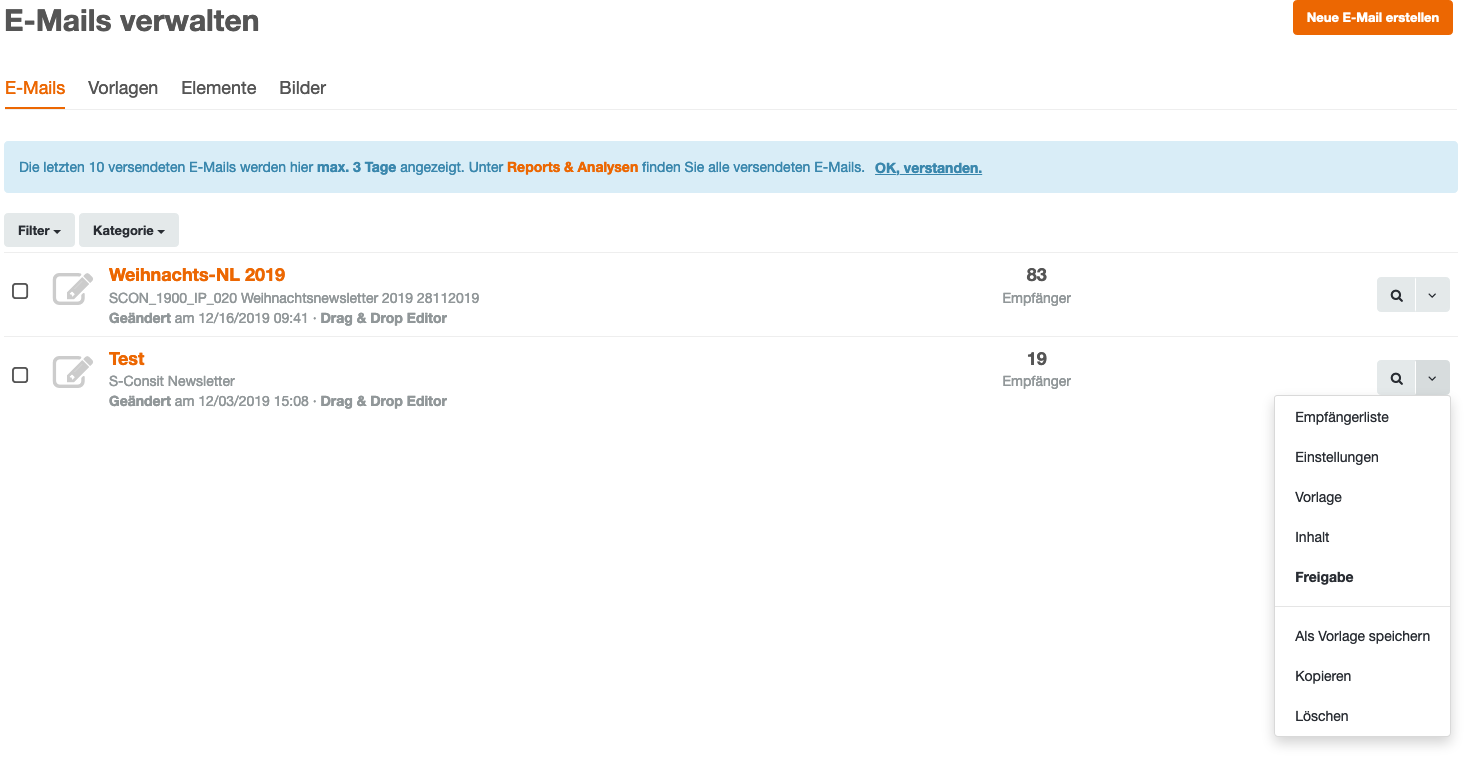Newsletter zu kopieren hat in der Vergangenheit manchmal zu Problemen geführt. Wenn jedoch ein identischer Newsletter von verschiedenen Absendern geschickt werden soll (s. z. B. Riello UPS), so empfiehlt es sich einen Newsletter komplett vorzubereiten, diesen als Vorlage zu speichern und basierend darauf dann die weiteren Exemplare anzulegen.