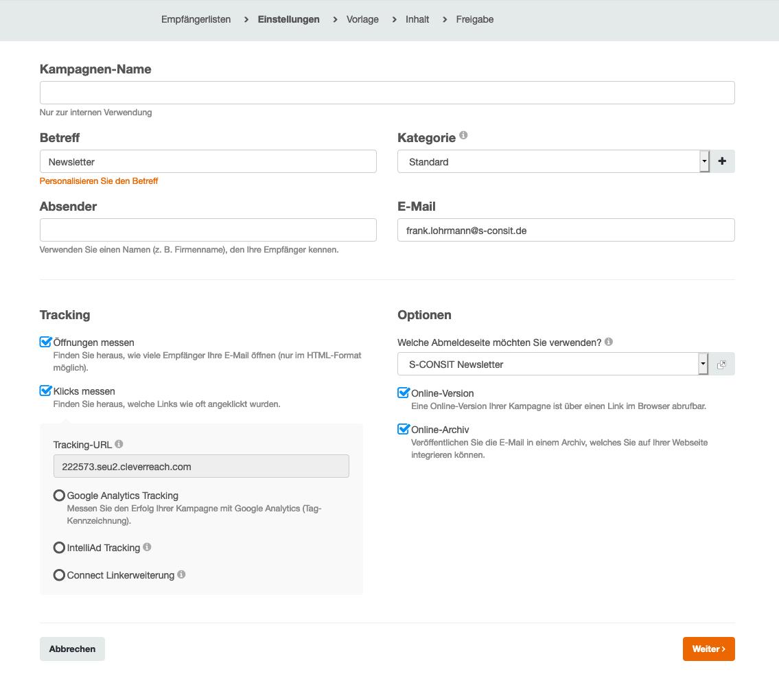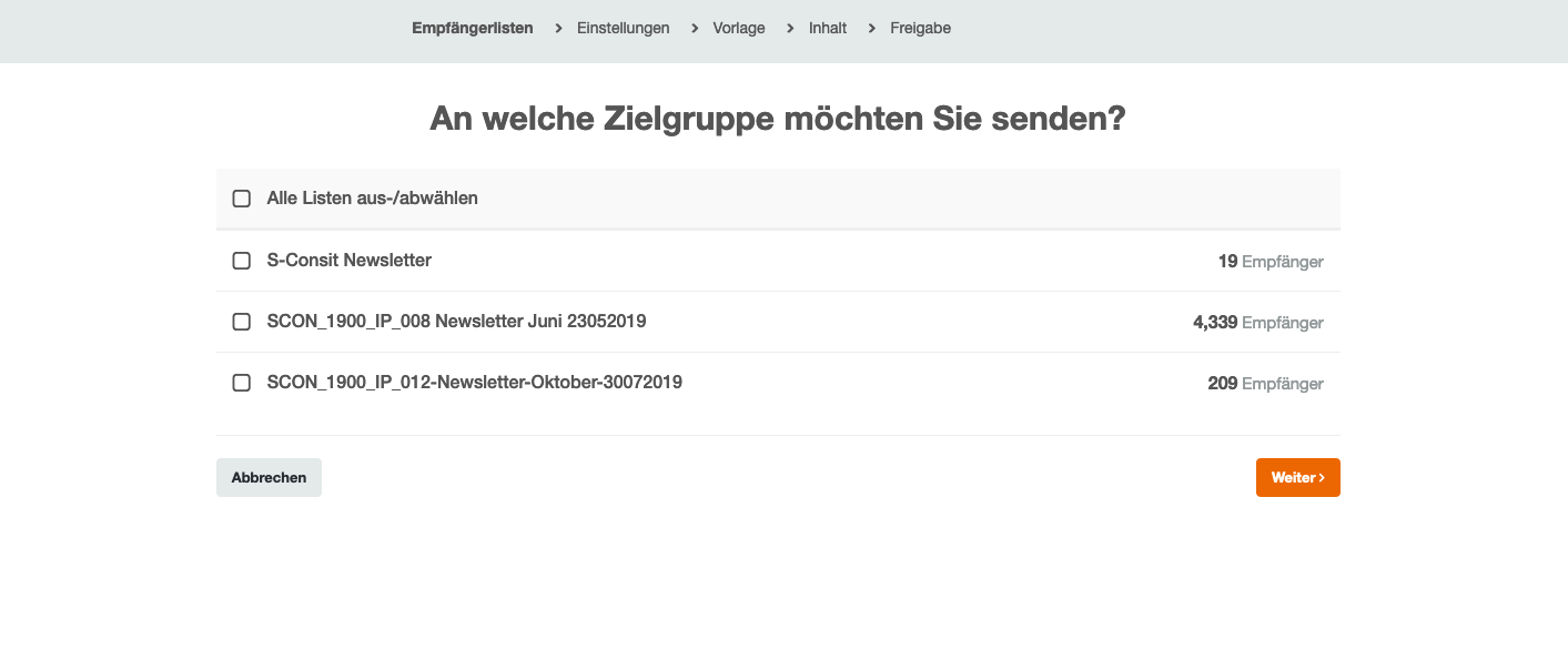 Über die Leiste oben lassen sich die vorherigen Schritte (Empfängerliste, Betreff etc.) jederzeit ändern.