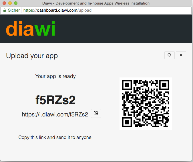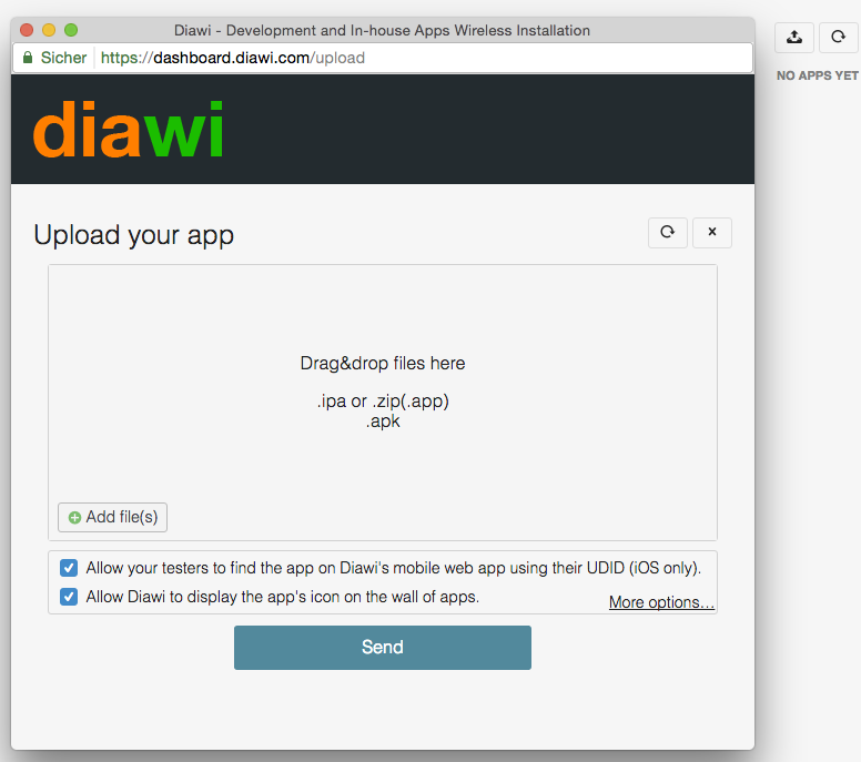 Diawi ist ein Online-Tool für die temporäre Verwaltung und Verfügung von mobilen Applikationen. Es ist ausgelegt für Android und iOS. Es können also die Archive der Applikationen hochgeladen werden und über einen Link an Nutzer (zumeist Tester/Kunden) verteilt werden. Diese Links sind für den Hochzwei-Account 7 Tage sichtbar und die Limitierung der Installationen liegt bei 25. Nach Ablauf der Zeit oder der Installationen, sind die Applikationen nicht mehr verfügbar. Die Installationen und Verfügungszeit können einmal kostenfrei zurückgesetzt werden.