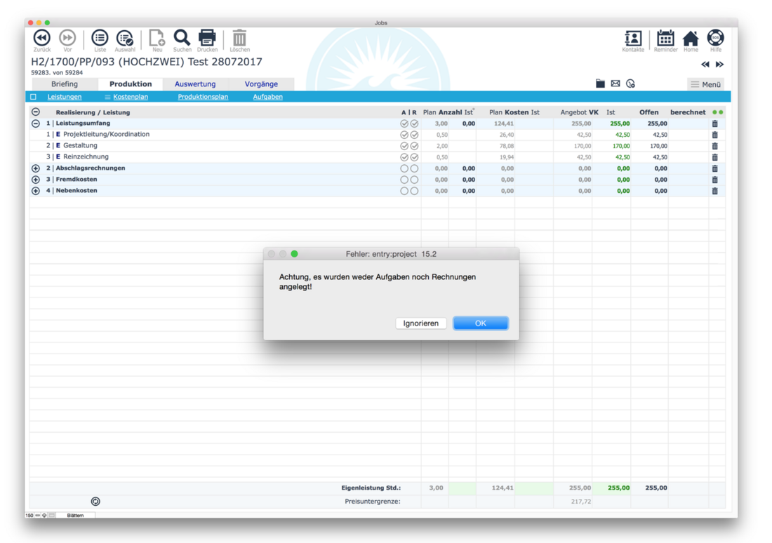 Wenn ein neuer Job angelegt wurde und man aus diesem herauswechselt, ohne Aufgaben angelegt zu haben oder eine Rechnung angelegt zu haben, erscheint nun ein kurzer Hinweis dazu. Sofern man dies lediglich vergessen hat, kommt man auf direktem Weg (über „ok“) wieder in den Job zurück und kann dies nachholen. Der Hinweis erscheint nur bei der Neuanlage eines Jobs.