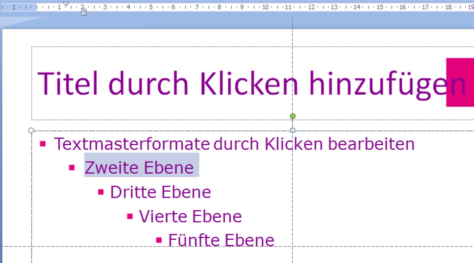- Ist z. B. auf einer Unterseite ein Textfeld zu wenig vorgesehen, z. B. für einen Untertitel, so kann ein neues Platzhalter-Textfeld eingefügt werden (KEIN normales Textfeld).