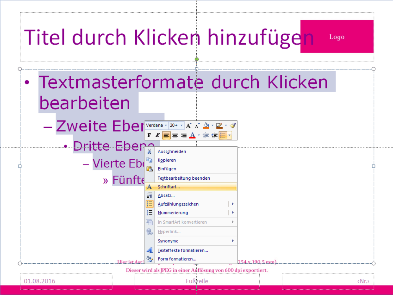 - Rechtsklick auf den zu bearbeitenden Text, dort „Schriftart“ wählen