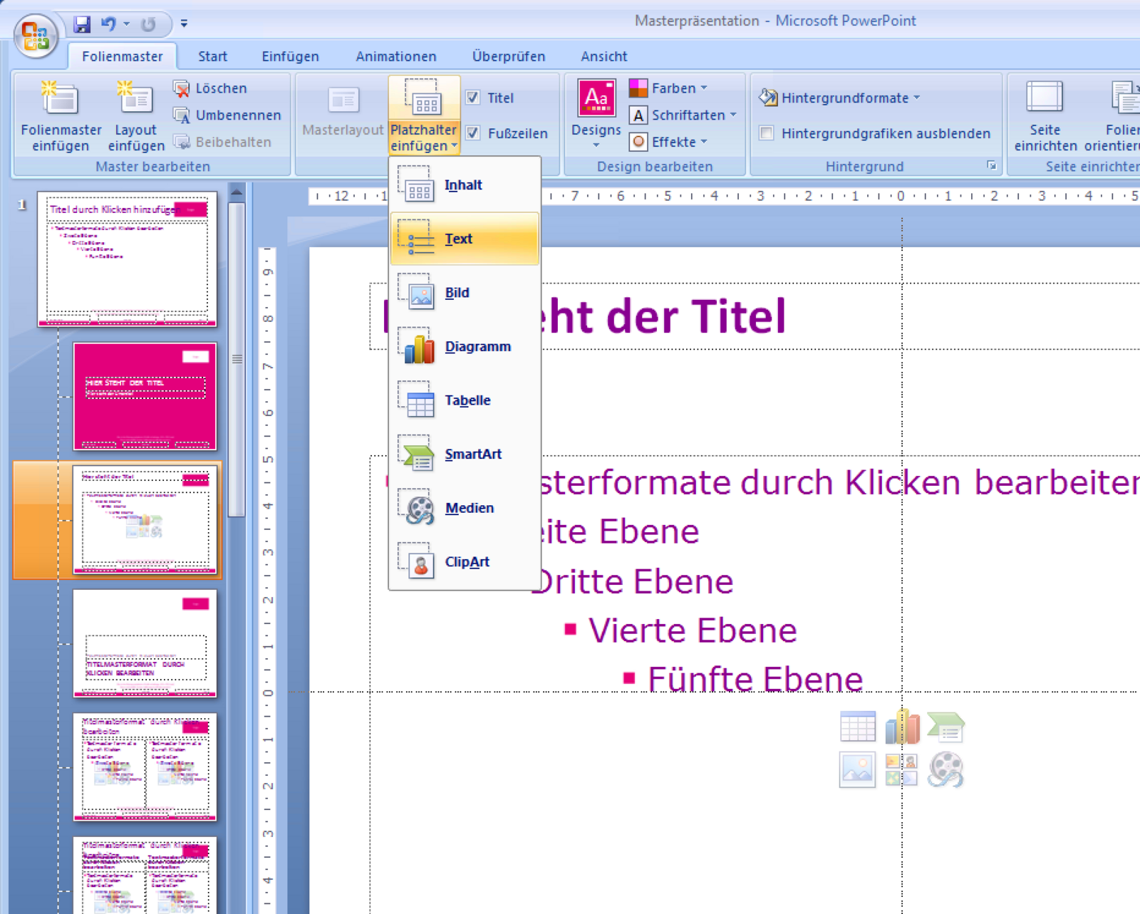 - Dafür im Menü Folienmaster, über das Panel Platzhalter einfügen/Text wählen.