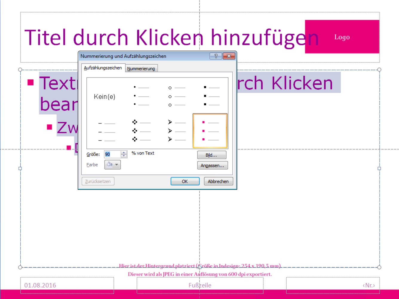 TIPP: Wenn das Aufzählungszeichen im Verhältnis zum Text zu groß oder zu klein erscheint, lässt sich im Nummerierungs- und Aufzählungszeichen-Menü die %-Größe im Verhältnis zum Text angeben.