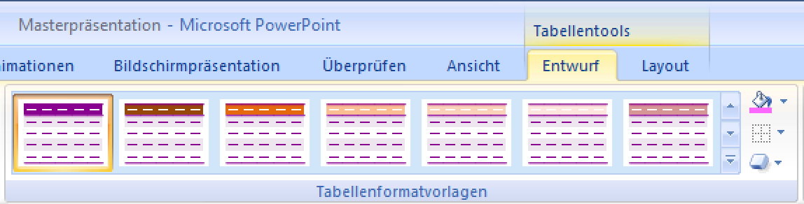 - Tabellen lassen sich nicht im Masterlayout definieren. Soll ein Tabellendesign in der Layoutvorlage enthalten sein, so ist es ratsam, in der normalen Präsentation eine Beispieltabelle anzulegen.