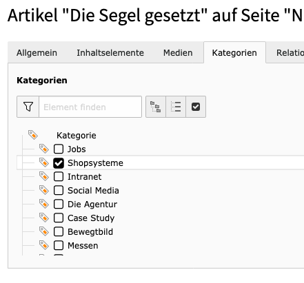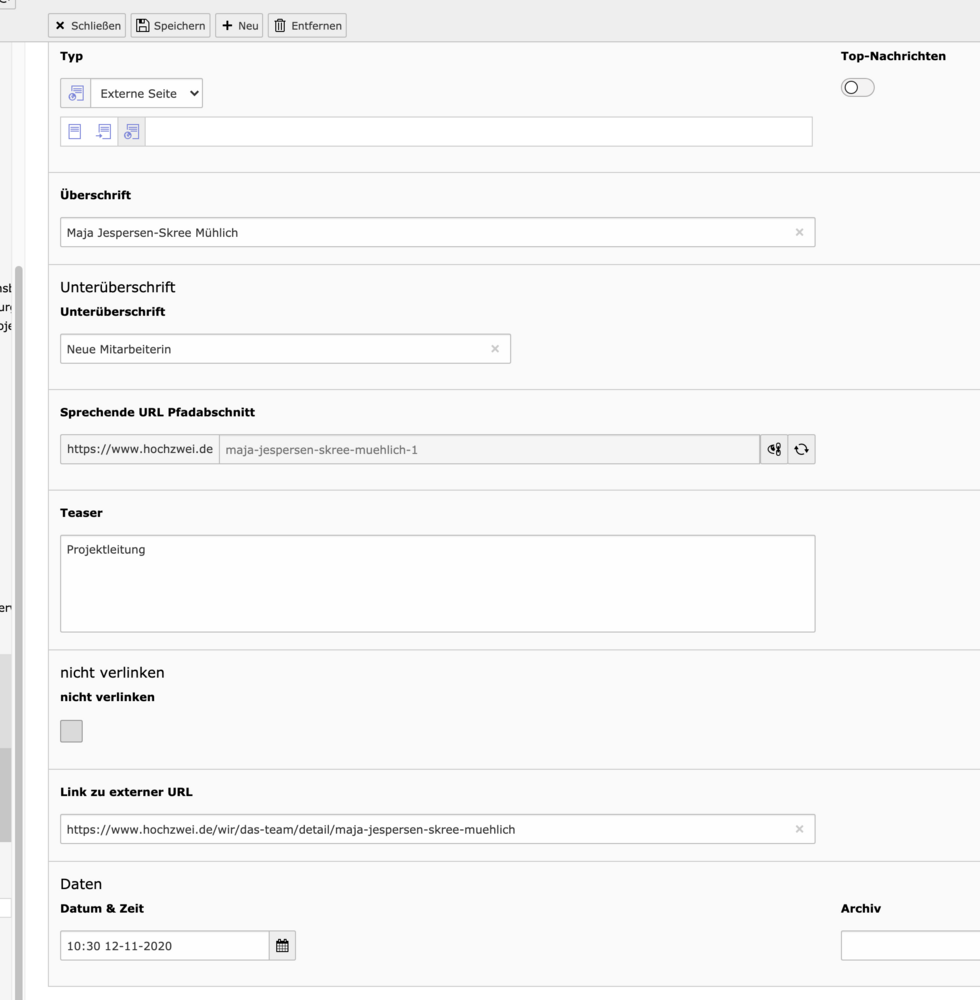 - Ausnahme eigene Pressemitteilung mit eigenem Text: Teaser, Text in Allgemein (kein Haken bei „nicht verlinken“), Teaser-Bild und Headgrafik unter „Medien“ -> Kategorien: Presse und Startseite
