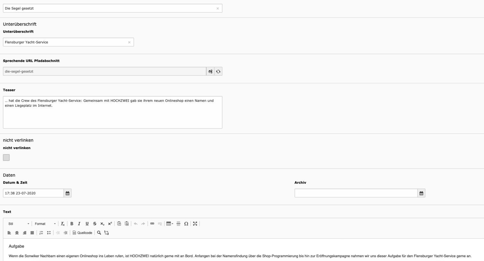 - die Presseartikel werden ähnlich der Kurznachrichten erstellt (Teaser freilassen, Textfeld füllen, „nicht verlinken“ anhaken, „jetzt Artikel lesen“ -> zum Artikel verlinken)