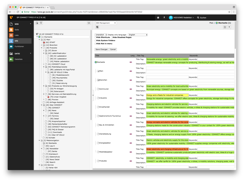 Hierfür muss man zunächst auf „Liste“ und dann „SEO-Management“ gehen. Klickt man nun auf „Edit SEO fields“ kann man alle SEO-Daten der verschiedenen Unterseiten gleichzeitig bearbeiten.