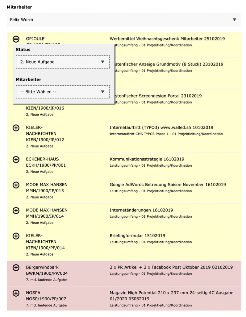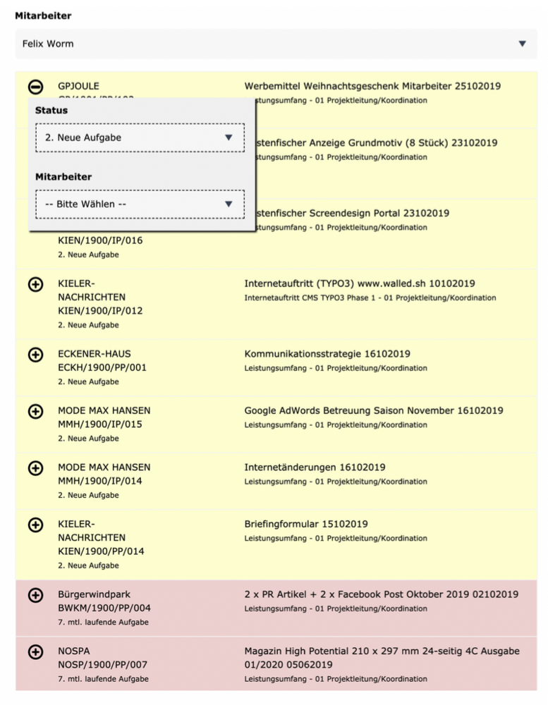 Hier kann ein Projektleiter einen Mitarbeiter wählen und den Status eines Jobs bzw. eines Projekts ändern sowie den Job einem anderen Mitarbeiter zuweisen.