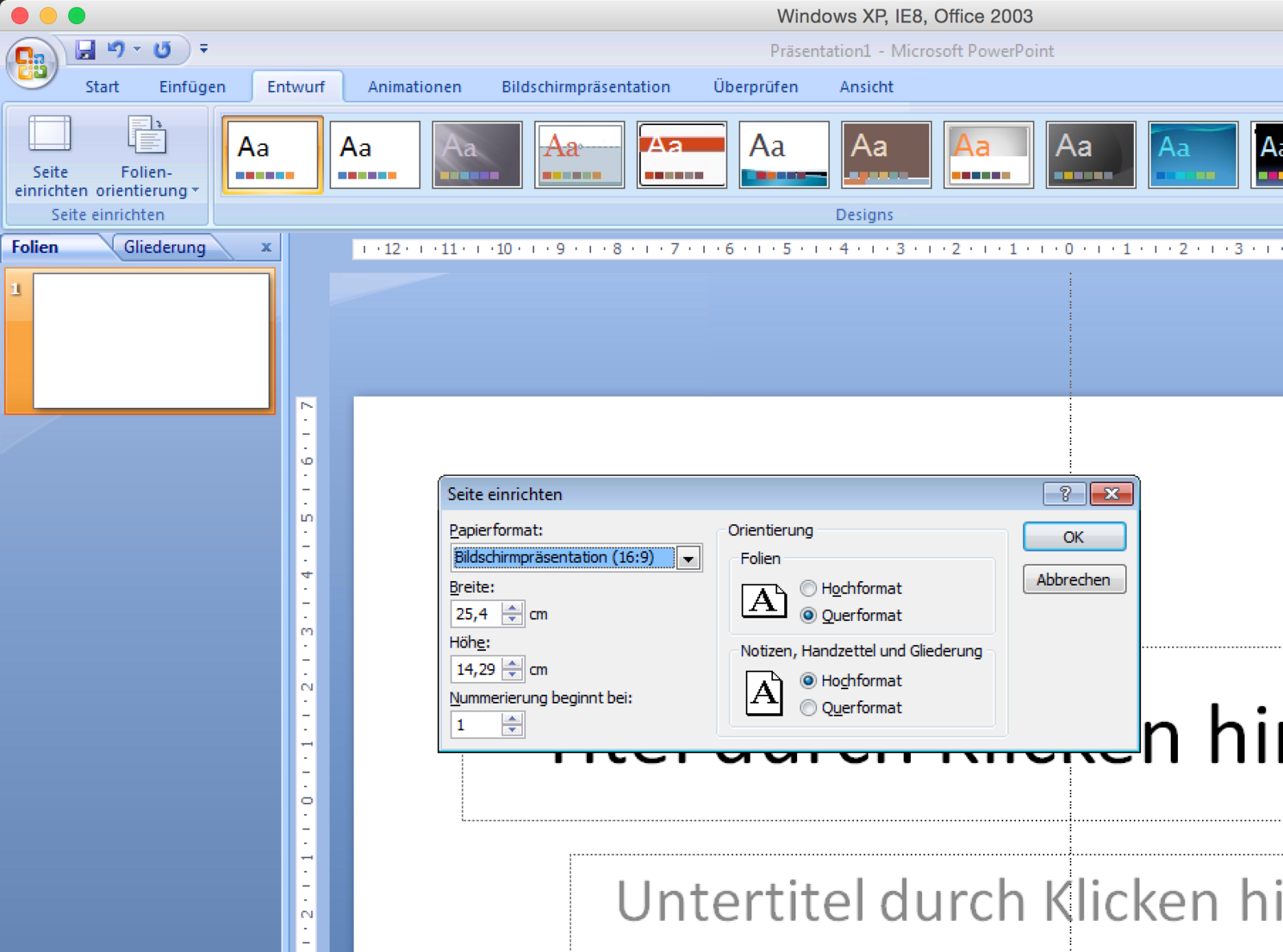 - Im Reiter Entwurf ganz rechts das Panel Seite einrichten anwählen.