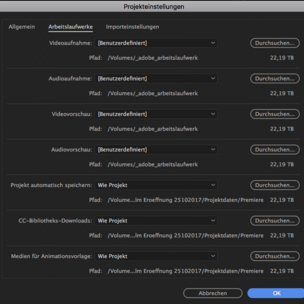 Das Arbeitslaufwerk von Premiere Pro ist auf jedem Rechner wie folgt einzustellen, damit alle Rechner auf die gleichen gecachten Dateien zurückgreifen. Zeit- und Speicherplatzersparnis: Am Jahresende können die gecachten Files komplett gelöscht werden. Ausgenommen Projekte an denen noch aktiv gearbeitet wird.