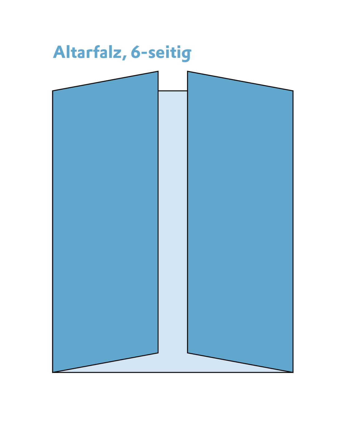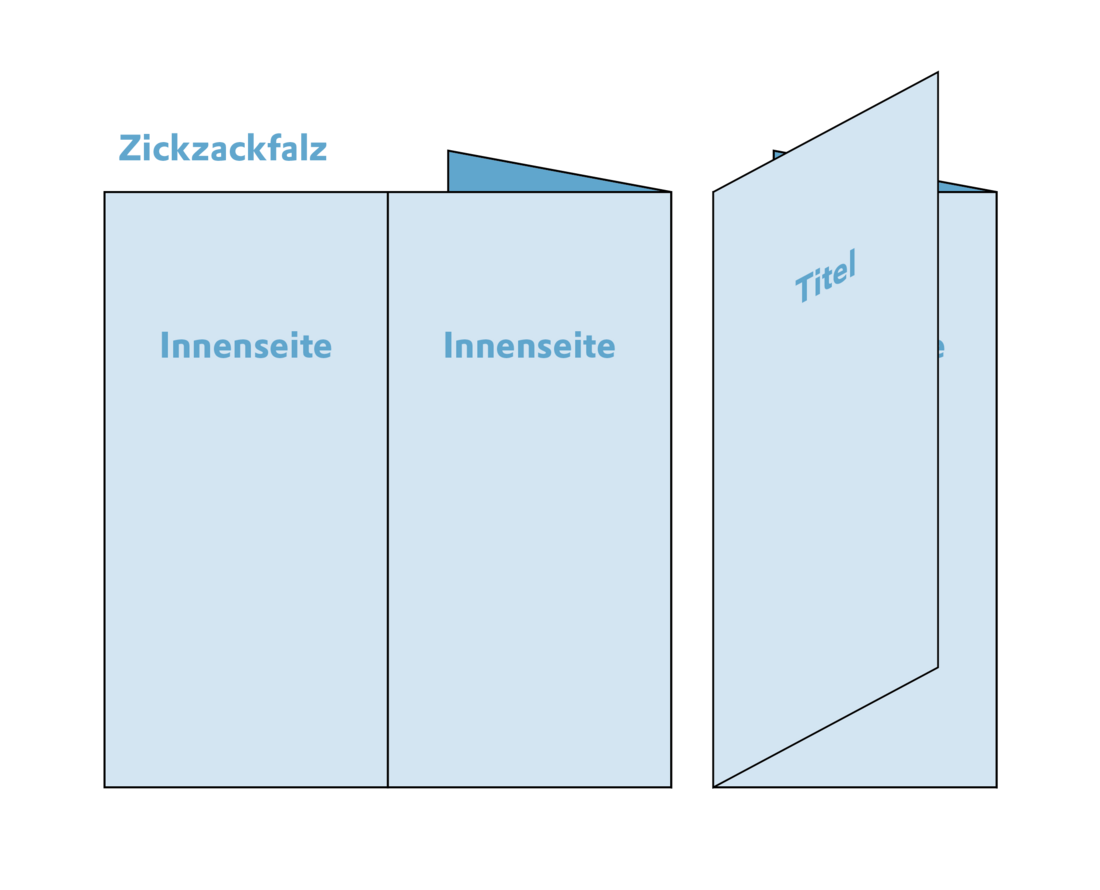 Der bei uns gängiste Parallelfalz ist der DIN-lang-Folder, ein 6-Seiter mit Parallelbrüchen, gewickelt oder im Zickzack. Ausgehend vom DIN A4 Format (297 x 210 mm) ergibt sich ein Endformat von 100 x 210 mm. eine der äußeren Seiten muss verkürzt angelegt werden, s. Skizze.