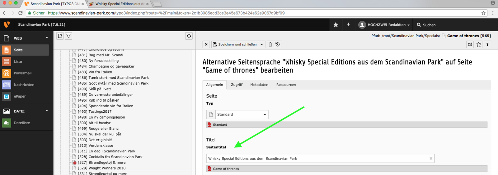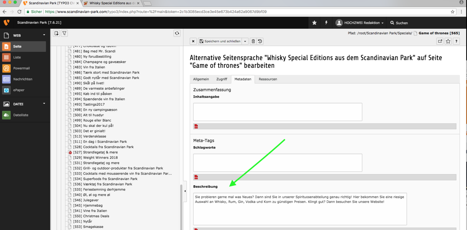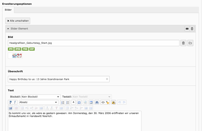 Unter dem Punkt „Specials“ liegen im Backend unsere Newsbeiträge. In diesem Fall kopieren wir einfach die letzte und verändern diese. Die News bestehen aus 4 Elementen: