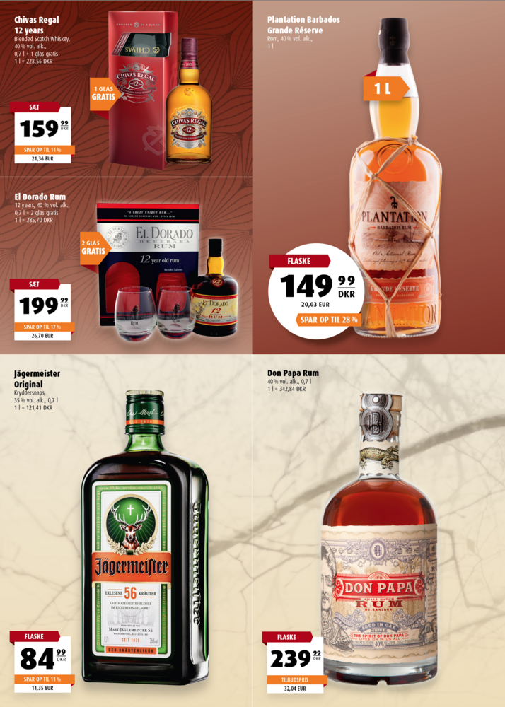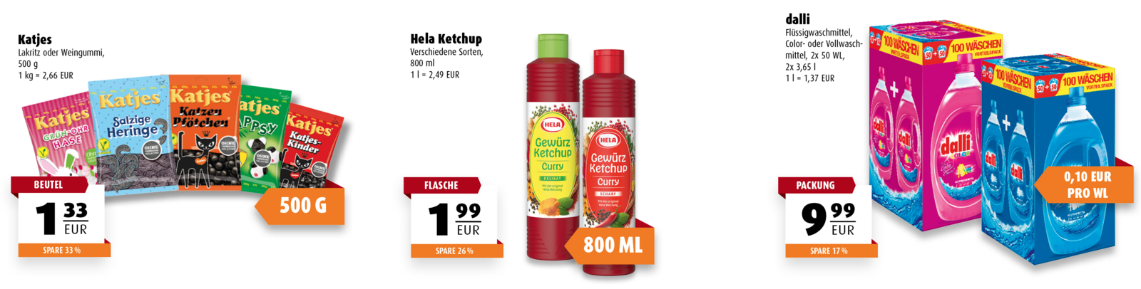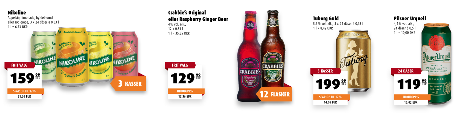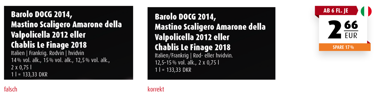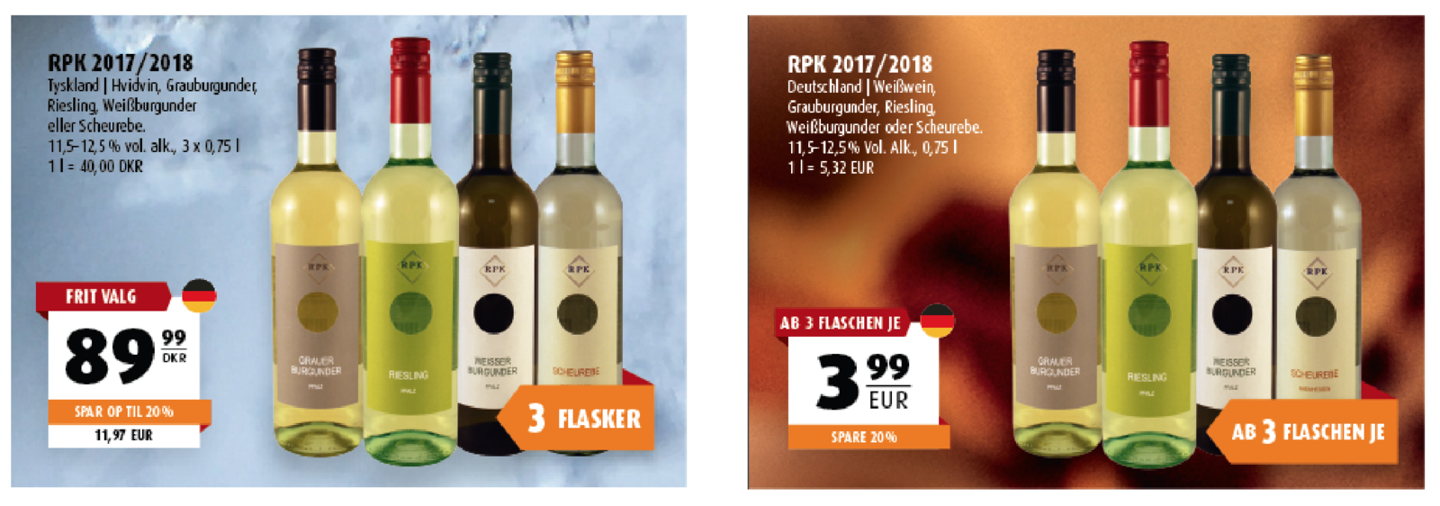 Oft werden Produkte im dänischen Prospekt für einen Bundlepreis angeboten (z. Bsp. bei Wein und Süßwaren). Im deutschen Prospekt wird hingegen immer der Einzelpreis ausgelobt.