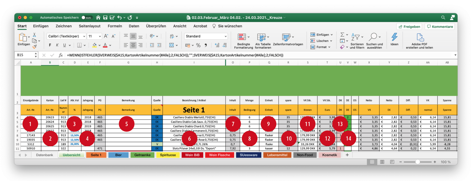 • Die Excell-Liste sollte ausgedruckt werden. So können Produkte abgehakt werden, Notizen gemacht werden, etc.