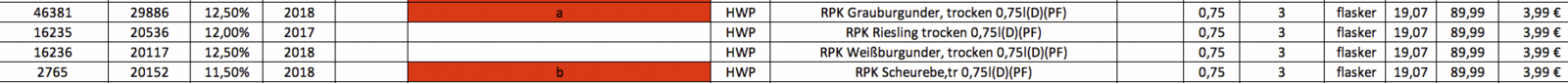 Nach der Länderherkunft wird ein senkrechter Strich gesetzt. Dann folgt die Bezeichung mit Satzende Punkt. Danach die Alkoholangaben (nicht einzeln aufgeführt, sondern zusammengefasst). Dann Anzahl und Inhalt. In die letzte Zeile der Grundpreis.