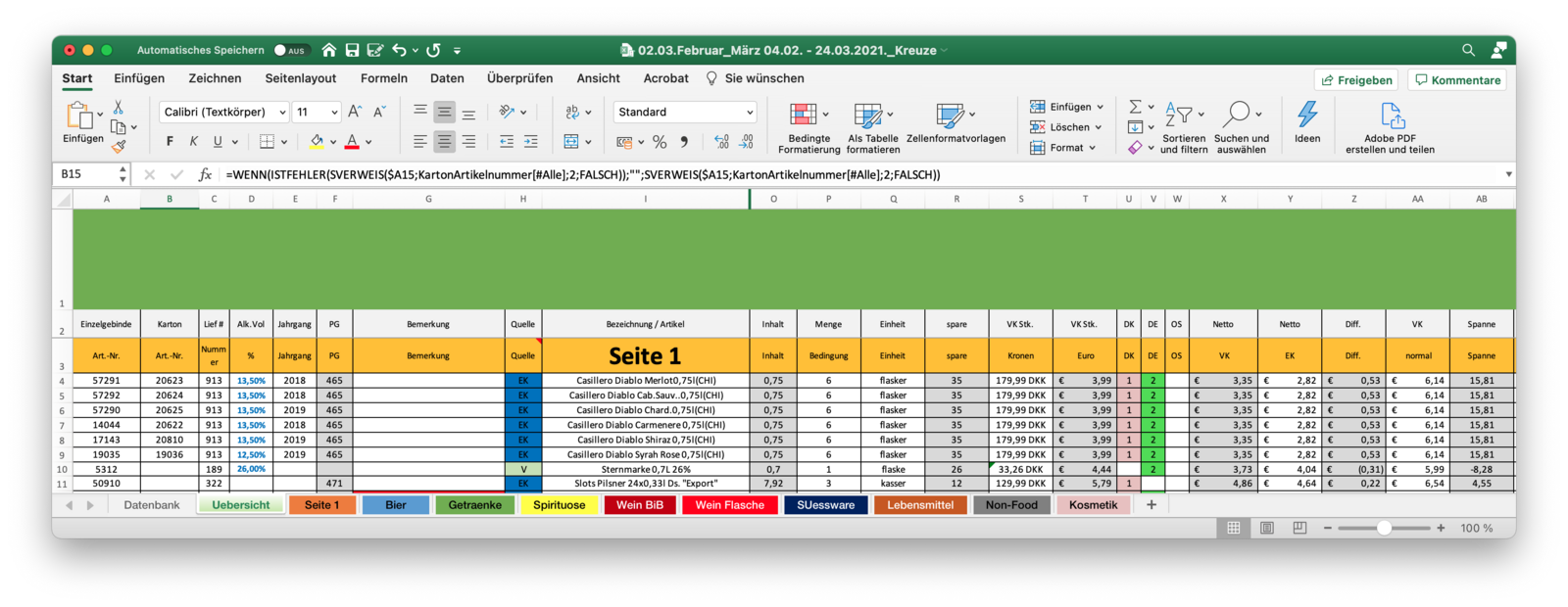 Einige Produkte werden in beiden Handzetteln beworben. Es kann im Vorweg Zeit gespart werden. Beispiel Casillero: Produkt ist für beide Sprachen ausgewählt. Das letzte Mal, dass Casillero in der Werbung war, ist bsp. Dezember 2020. Dieses notieren und – wenn der deutsche Prospekt in Arbeit ist – im Dezember DE schauen, ob der Casillero auch dort zu finden ist.