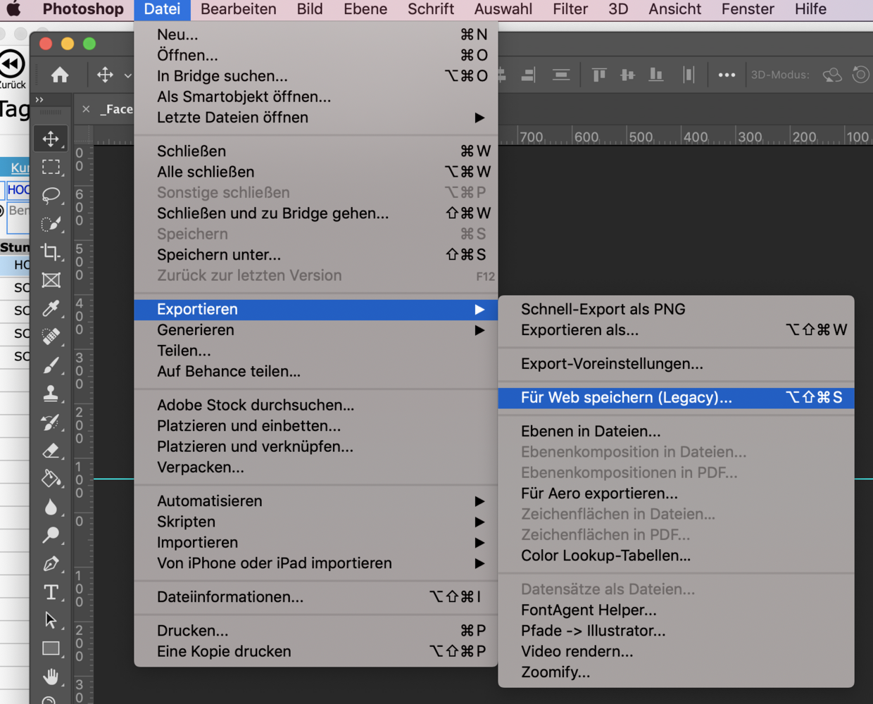 So hast du bei 20-35 Postings einen besseren Überblick. Ebenso solltest du die anschließend JPGs so benennen. Die exportierst du in Photoshop über Datei > Exportiert > Für Web speichern. Pass hier auf (wenn du FB und INSTA Grafiken in einer Datei erstellst), dass du die jeweiligen Grafiken im richtigen Ordner abspeicherst.