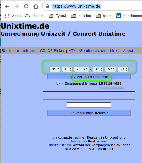 - https://www.unixtime.de aufrufen, gewünschtes Datum auswählen und die Timestamp kopieren